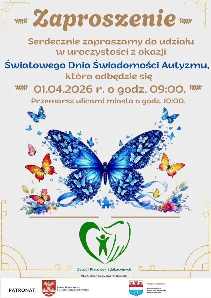 W Nowym Dworze Mazowieckim przygotowywane jest wydarzenie, które ma skupić uwagę na autyzmie i codziennych doświadczeniach osób w spektrum. 1 kwietnia 2026 roku Zespół Placówek Edukacyjnych organizuje uroczystość z okazji Światowego Dnia Świadomości Autyzmu. Nad przedsięwzięciem honorowy patronat objął burmistrz miasta.