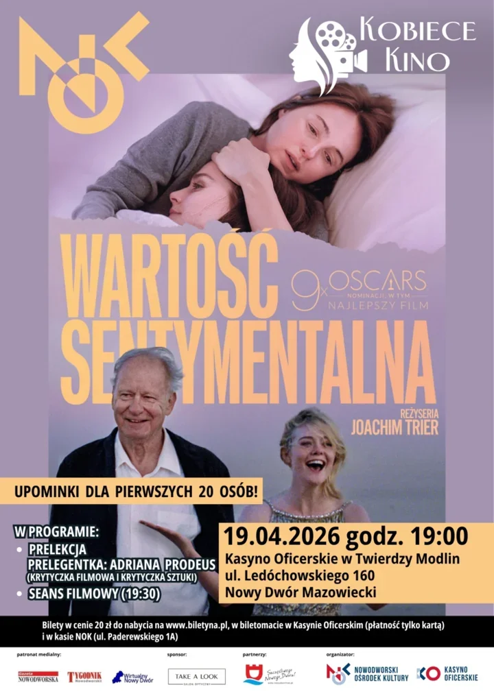 W Kasynie Oficerskim w Twierdzy Modlin znów zrobi się filmowo i bardzo po ludzku. Na 19.04.2026 Nowodworski Ośrodek Kultury szykuje kolejne spotkanie z cyklu „Kobiece Kino” - z rozmową przed seansem, dobrym kinem i atmosferą, która aż prosi się o wieczorne wyjście w mieście. 🎬
