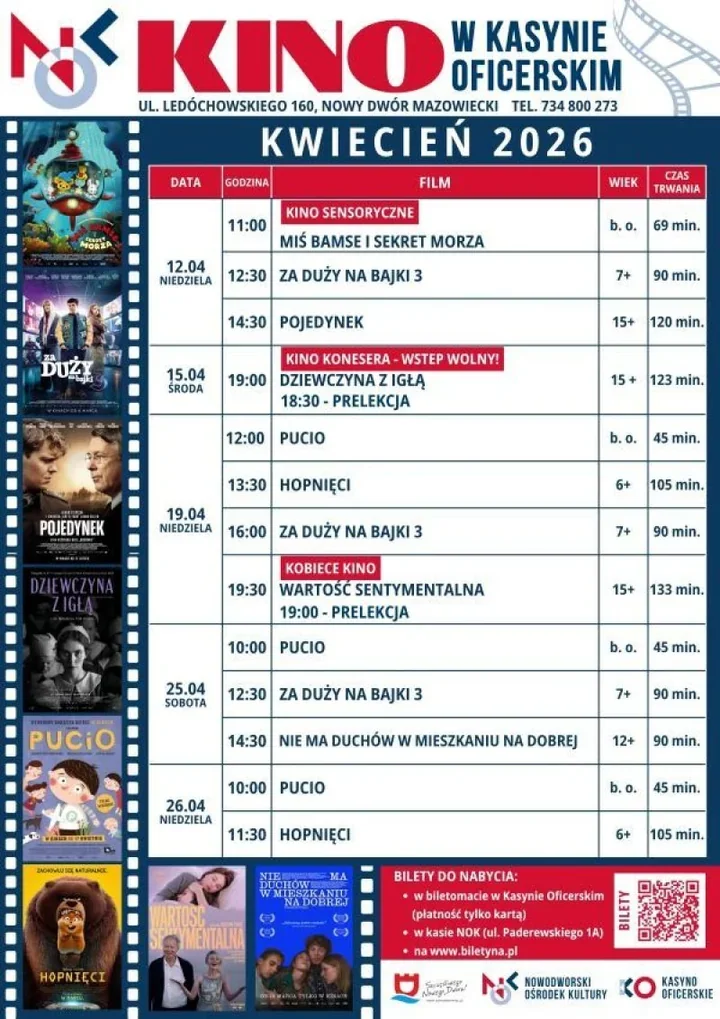 W Nowym Dworze Mazowieckim kino znów bierze na siebie rolę miejsca spotkań, a nie tylko zwykłego seansu. W Kasynie Oficerskim kwiecień układa się w filmową mapę dla rodzin, dzieci i widzów szukających mocniejszych emocji. W programie są zarówno lekkie tytuły na wspólne wyjście, jak i obrazy, po których rozmowa zostaje na dłużej.